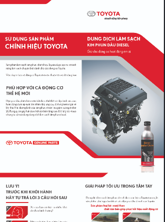 Hiểu được điều đó, các kỹ sư Toyota đã nghiên cứu và cho ra đời sản phẩm “Dung dịch súc rửa động cơ xăng” . Dung dịch sẽ làm phân rã các cặn bẩn bám dính bên trong động cơ, đáy các-te và hấp thụ các cặn bẩn này trong dầu để xả chúng ra ngoài. Đặc biệt, với đặc tính tẩy rửa mạnh mẽ nhưng không chứa bất kỳ thành phần dung môi nào, “Dung dịch súc rửa động cơ xăng” sẽ không làm tốn hại đến gioăng phớt động cơ, kể cả đối với động cơ của những xe cũ.